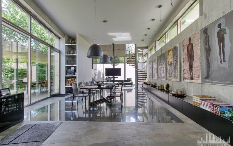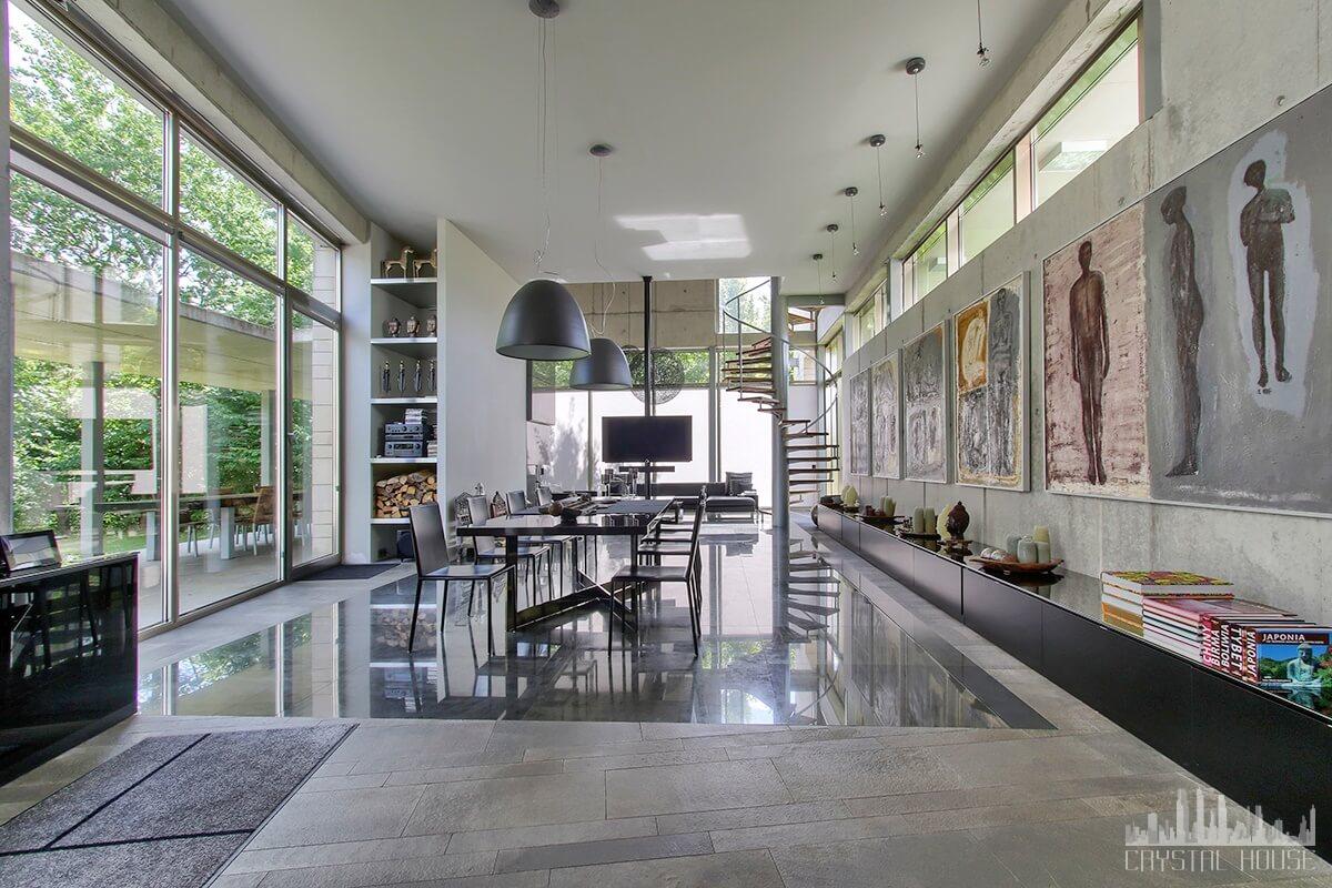 What makes the house stand out is the evergreen and at the same time modern architecture that blends perfectly with the surroundings. A fair coloured façade makes the building look extremely light. The interiors are decorated in an artistic, yet minimalistic style and the house is very bright owing to the large windows. The black furniture and grey and graphite finishing pair well together and the monochromatic colour scheme is juxtaposed with colourful contemporary paintings.