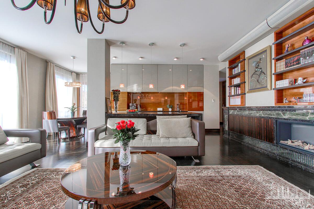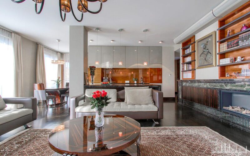 The nearly 165 m2 apartment with a 14-metre recessed balcony is available for sale exclusively through my company Crystal House. The apartment was finished to the topmost standard, and the interior design was inspired by the Modernist and Art Deco movements in art and architecture. The apartment has a south-east orientation and is bright.