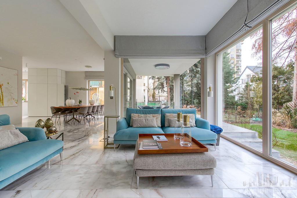 Sam dom to przepiękna, nowoczesna architektura, gdzie główną rolę gra jasna przestrzeń i ogromne okna, które zapewniają świetnie doświetlenie. Nowoczesna elegancja jest widoczna na każdym kroku. Od razu widać, że pierwszym właścicielom zależało na stworzeniu domu luksusowego w bardzo wysokiej jakości.