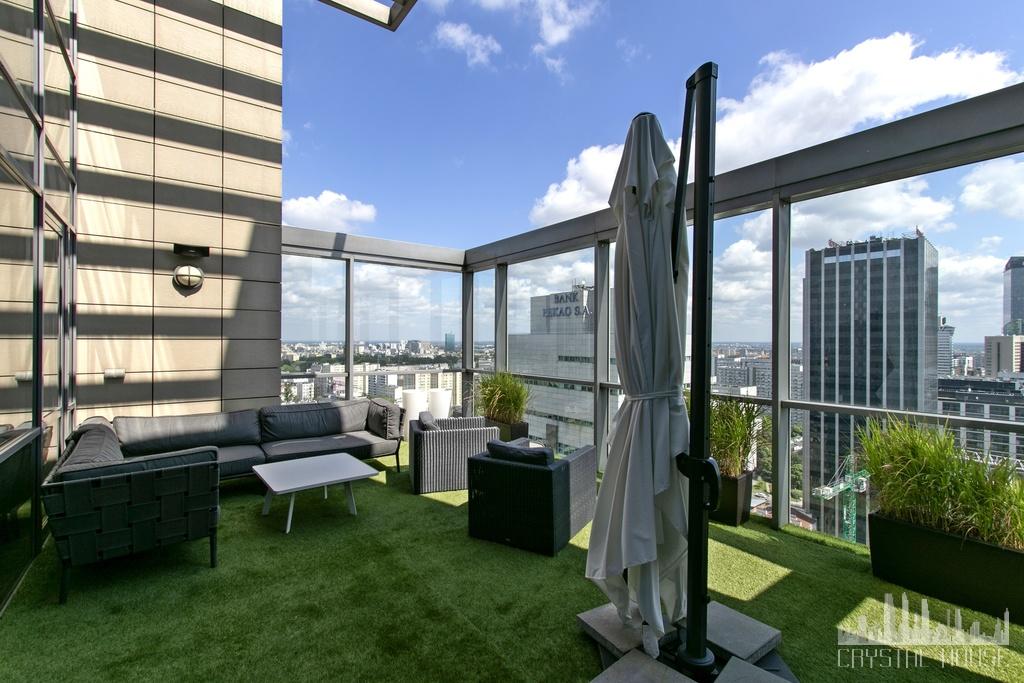 Właśnie w takiej okolicy znajduje się wspomniany wcześniej penthouse z niesamowitym tarasem i fantastycznym widokiem na Warszawę. Dwupoziomowy apartament liczy blisko 200 m2 i ma dwie sypialnie (w tym master bedroom z pokojem kąpielowym), dwie łazienki, obszerny salon z jadalnią i aneksem kuchennym oraz garderobę. Apartament został wykończony w najwyższym standardzie: jest w pełni klimatyzowany, ma ogrzewanie podłogowe, sprzęt kuchenny Siemens, armaturę Hansgrohe, a także niesamowity sprzęd HiFi.