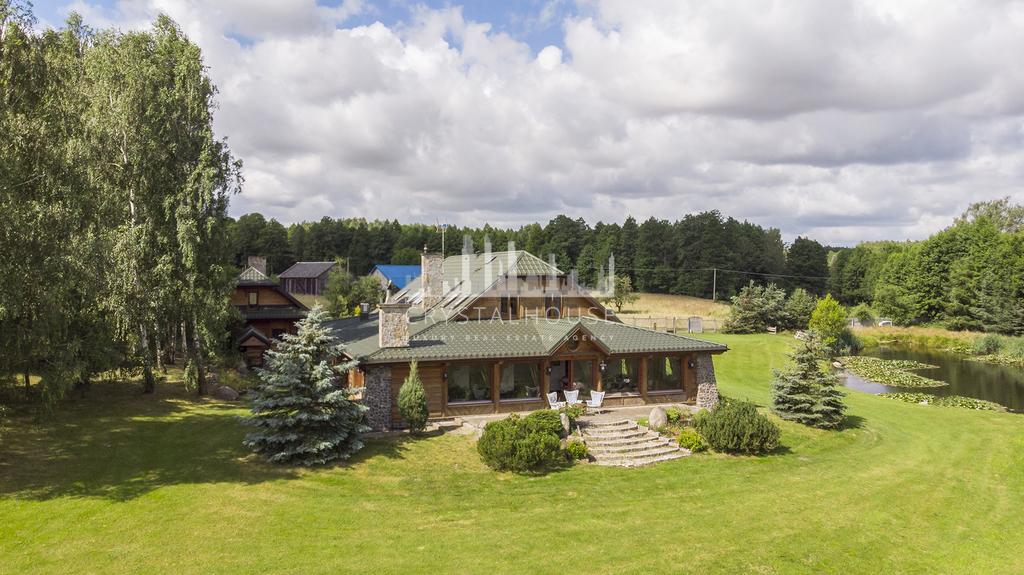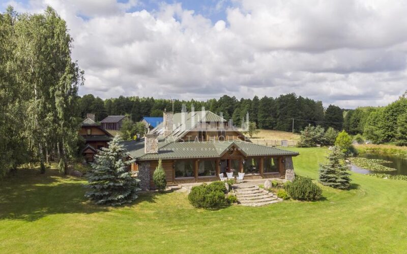 Malownicza posiadłość, którą dziś chciałbym Wam zaprezentować, to wolnostojący dom otoczony zielenią i położony nas stawem (do nieruchomości przynależy długa linia brzegowa). Duży bo blisko 600-metrowy dom został wybudowany z grubych drewnianych bali, co nadaje mu bardzo rustykalny charakter.
