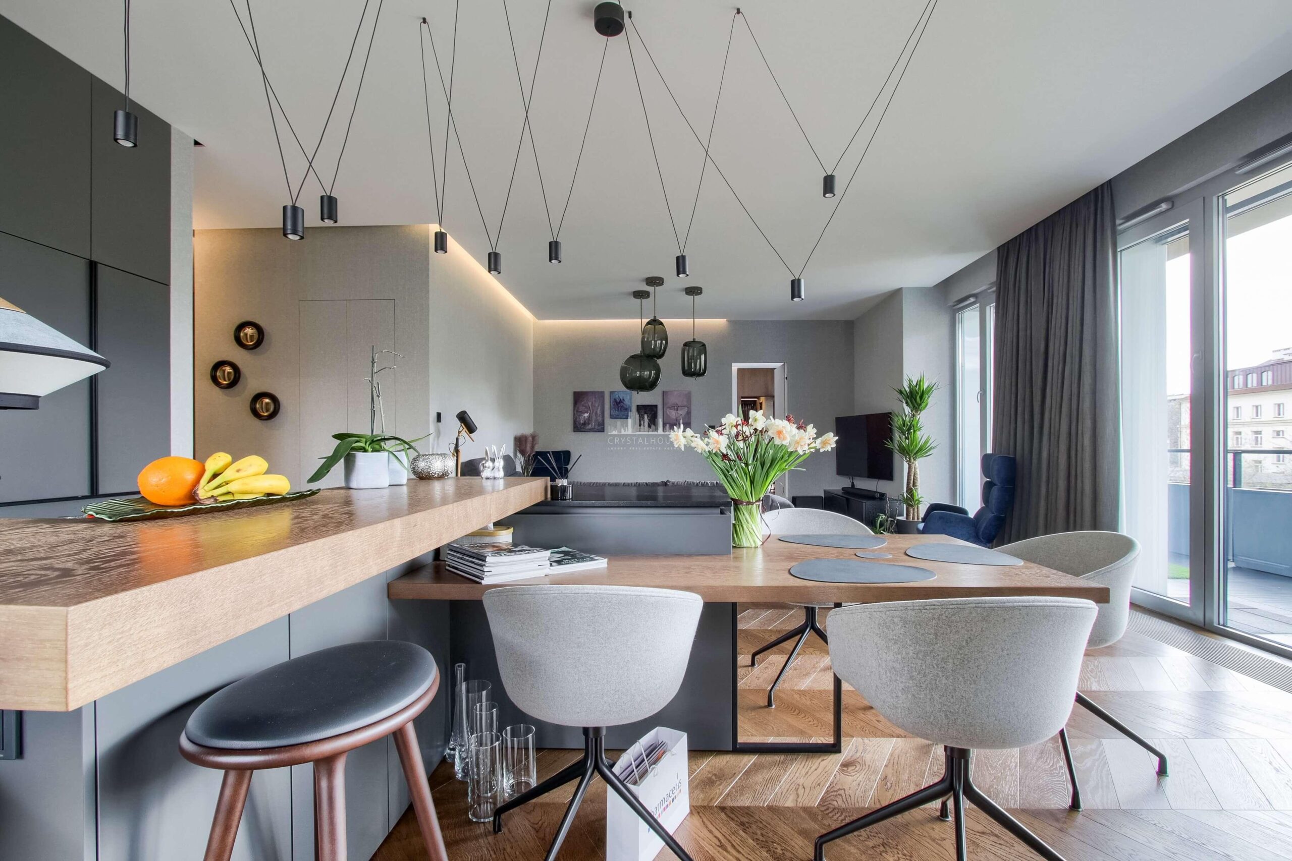 Apartament został wykończony w stylu nowoczesnym – jest industrialne, ale jednocześnie ciepło i przytulnie. Do wykończenia minimalistycznych wnętrz wykorzystano kamień, drewno i najwyższej jakości sprzęty i instalacje. Jest tu bardzo estetycznie i funkcjonalniem a jednocześnie przyjemnie. Warto wspomnieć, że dzięki przeszkleniom od sufitu do podłogi pomieszczenia są wspaniale doświetlone, a ogromny 40-metrowy taras stanowi naturalne przedłużenie przestrzeni. Do apartamentu przynależą 3 miejsca parkingowe w garażu podziemnym.