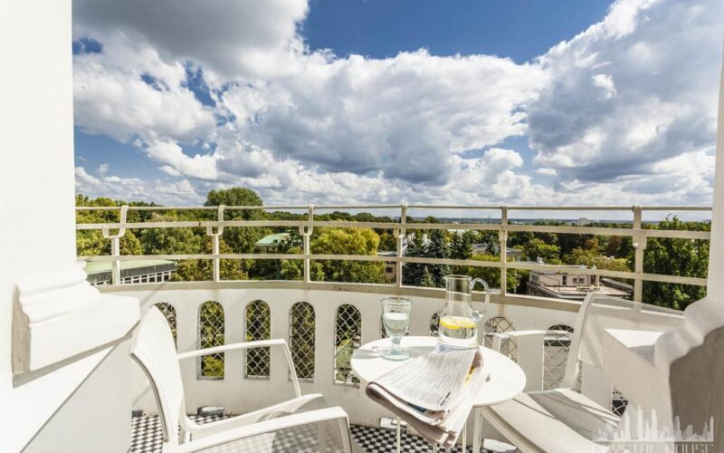 Apartament znajduje się na 5 piętrze. To bardzo wysokie mieszkanie – od podłogi do sufitu jest aż 3,6 metra. Mieszkanie zostało zaaranżowane w standardzie luksusowym, z wyraźnym podziałem na część oficjalną i prywatną. Jest tu ogromny salon z widokiem na Belweder, idealny do przyjmowania gości. Są trzy sypialnie, w tym jedna z łazienką, gabinet, pokój rekreacyjny, łazienka dla gości i toalety. Ze wszystkich okien rozciąga się widok na Warszawę.