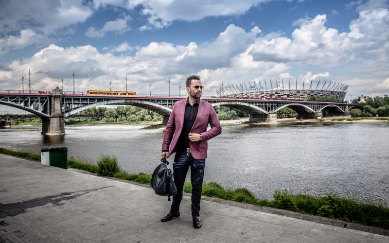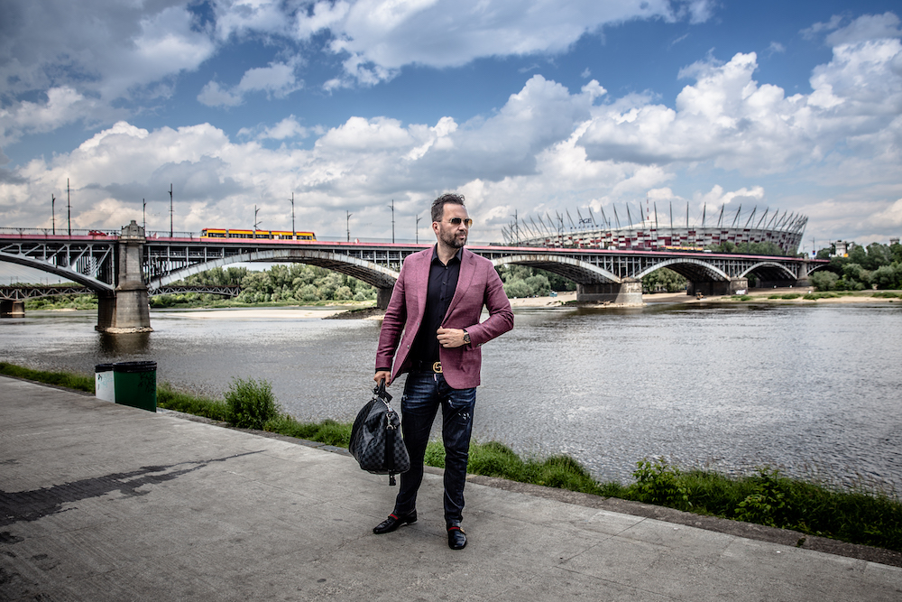 Mężczyzna z torbą Louis Vuitton na tle mostu